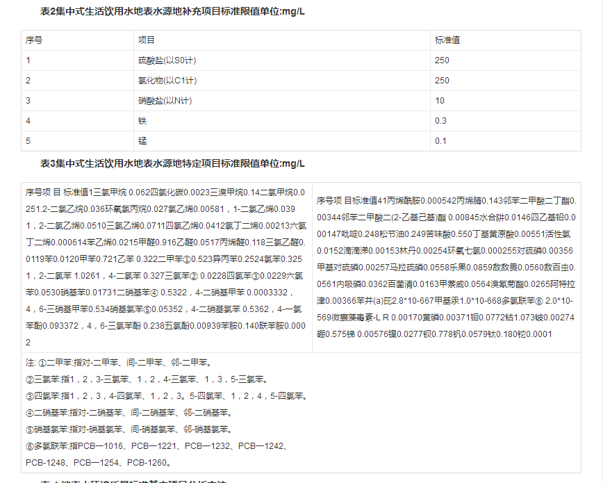 集中式生活飲用水地表水源地水質(zhì)評價(jià)的項(xiàng)目應(yīng)包括表1中的基本項(xiàng)目、表2中的補(bǔ)充項(xiàng)目以及由縣級以上人民政府環(huán)境保護(hù)行政主管部門從表中選擇確定的特定項(xiàng)目。