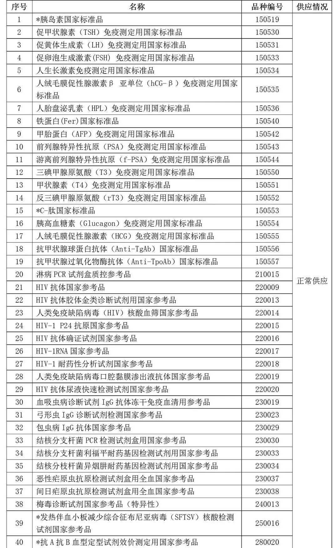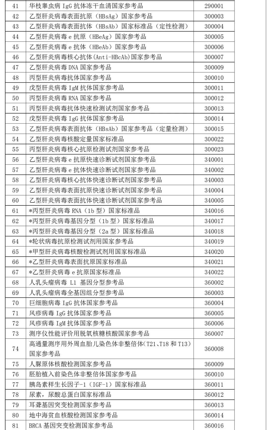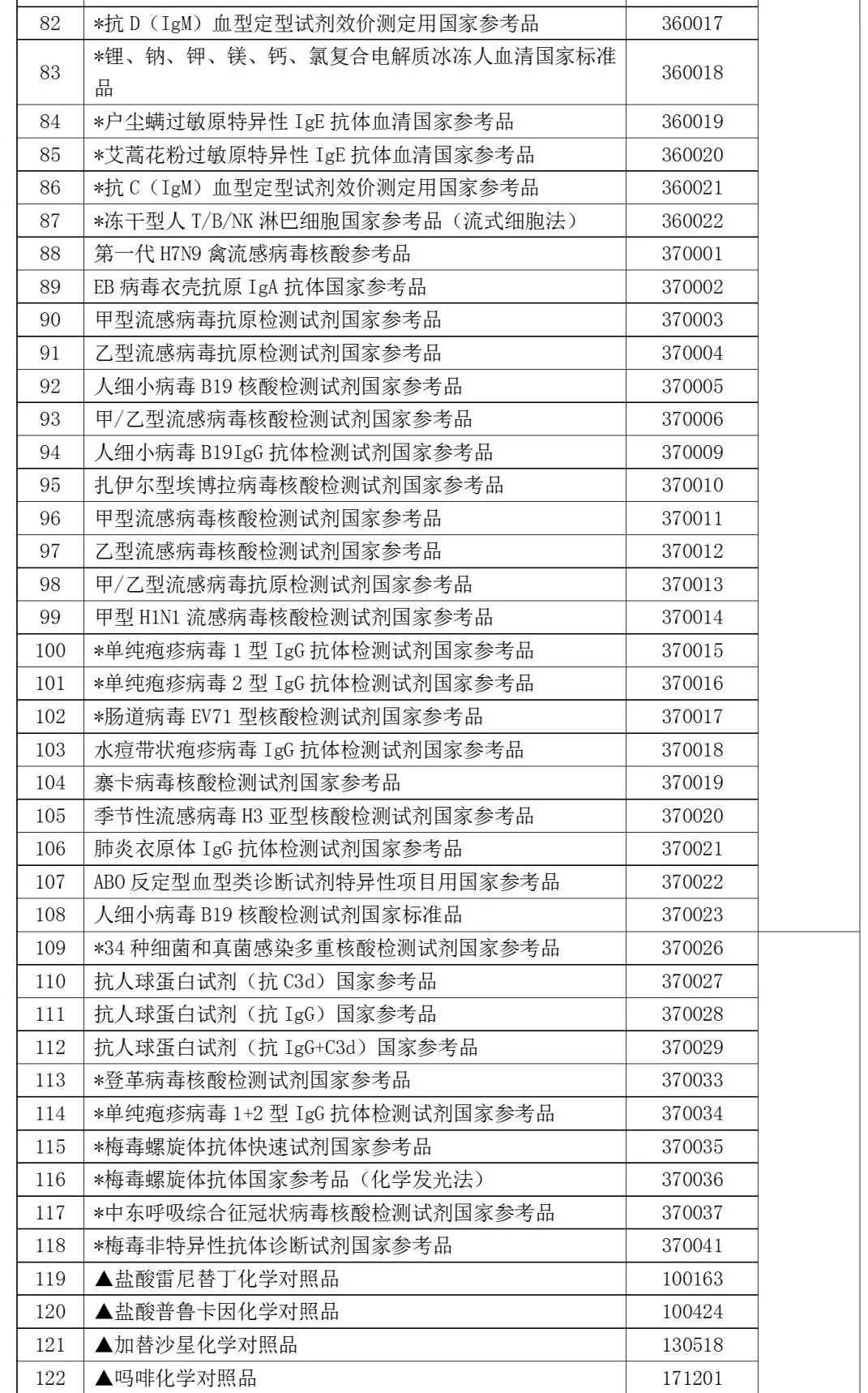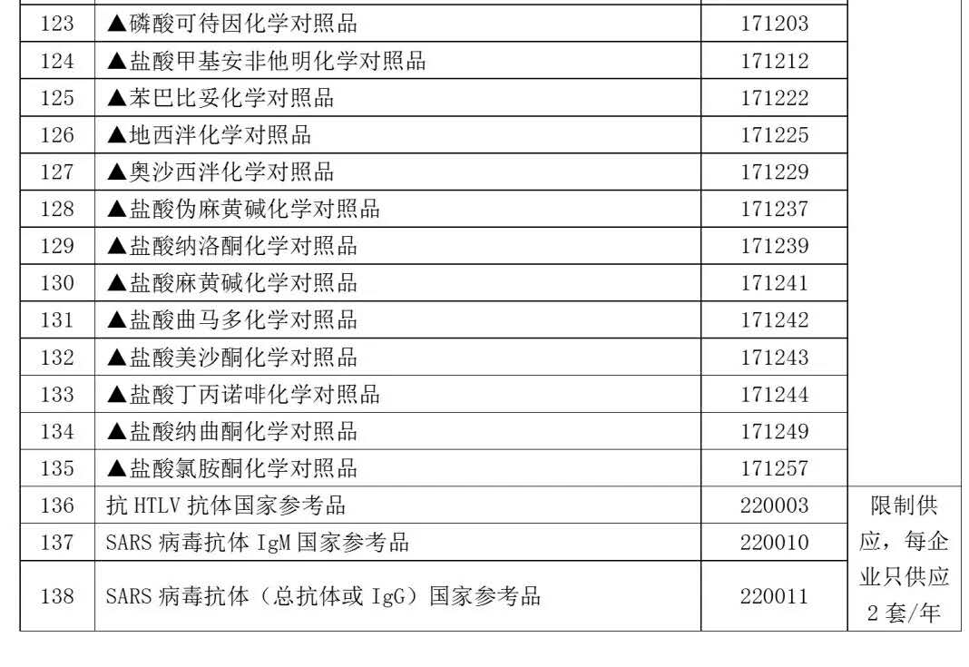 1. *標(biāo)識(shí)品種為本期目錄新增體外診斷試劑標(biāo)準(zhǔn)物質(zhì)。 2. ▲標(biāo)識(shí)品種為可用于體外診斷試劑檢驗(yàn)的化學(xué)對(duì)照品。 3. 限制供應(yīng)是指僅供給相關(guān)體外診斷試劑生產(chǎn)企業(yè)。